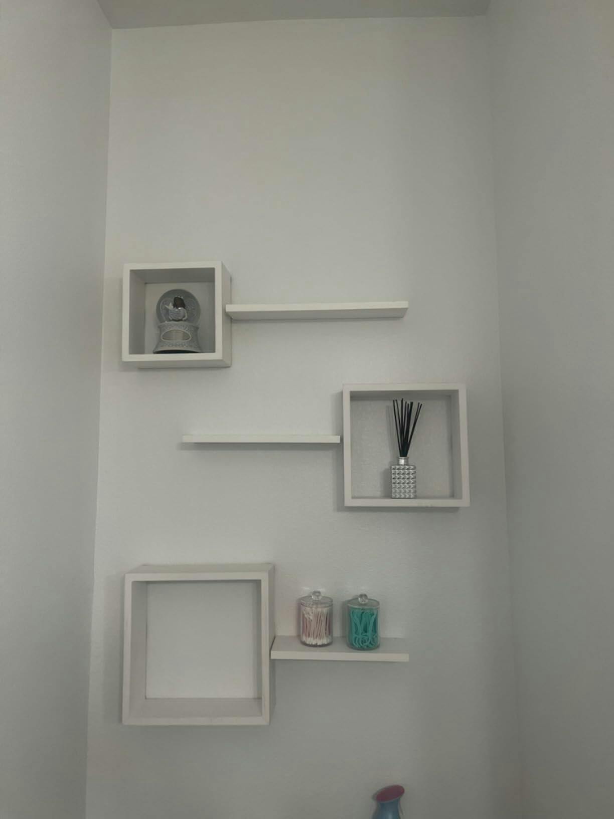 Il combine forme et fonction : la finesse des étagères flottantes avec l’effet visuel des cubes.